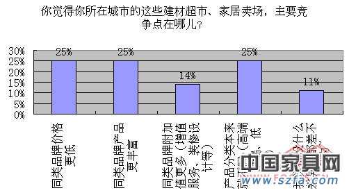 賣場數(shù)量的增多同時也引發(fā)了業(yè)界另一層思考:對于普通消費者,除了地域的便利性因素,還有哪些因素決定或影響著消費者的選擇?無論是當(dāng)?shù)赝辽灵L的賣場,全國連鎖的賣場,或者外來的“洋”賣場,究竟是什么在刺激著人們的消費?針對“你覺得你所在城市的建材超市、家居賣場,主要競爭店在哪兒”這一多選題,大多數(shù)網(wǎng)友(25%)選擇了“同類品牌價格更低”“同類品牌產(chǎn)品更豐富”“產(chǎn)品分類本來就不同”這幾點,另有14%的網(wǎng)友選擇了“同類品牌附加值更多(增值服務(wù)、裝修設(shè)計等)”,還有14%的網(wǎng)友表示“沒什么差異,都差不多”。而在走訪這些賣場時,記者也同不少品牌經(jīng)銷商或廠家直銷商進行了交談。但從交談結(jié)果來看,無論是大樹、亞振等家具品牌,金牌等櫥柜品牌,HCG等衛(wèi)浴品牌,還有德爾、安信等地板品牌,大多是全市甚至全國統(tǒng)一價,只是依據(jù)門店的占地面積大小,對展示產(chǎn)品多少有所影響。而撇開獨立旗艦店,在同類賣場中,這些品牌的拿店面積都差不多,產(chǎn)品展示自然也差不多,因此,其實同城中目前家居賣場的同質(zhì)化程度相對較高。