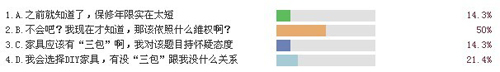 而針對購買家具時遇到的問題調(diào)查,多項(xiàng)選擇的結(jié)果出乎意料,所有調(diào)查者都曾有過“貨不對板”的遭遇,再頂著山寨版的家具“三包”制度,消費(fèi)者真的有苦難言了。正在裝修的歐女士接受搜房家居網(wǎng)記者采訪時表示,在網(wǎng)上淘家具產(chǎn)品最擔(dān)心的就是質(zhì)量問題,貨不對板尤其嚴(yán)重,這種以次充好的現(xiàn)象令其煩不勝煩。而在實(shí)體店購買家具產(chǎn)品,同樣有這樣的擔(dān)心,所以她最終決定直接要了店面的樣板產(chǎn)品,一解后顧之憂。