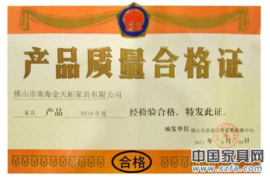 金天拓家具榮獲“產(chǎn)品質(zhì)量合格證”