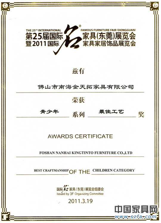 在剛剛結(jié)束的第25屆國際名家具(東莞)展覽會上,經(jīng)海內(nèi)外家具專家評委層層把關(guān),數(shù)次評審,在近百家青少年兒童家具參評企業(yè)中,佛山市南海金天拓家具有限公司憑借精湛的工藝和精細的設(shè)計,成功脫穎而出,被專家評委一致推選,當(dāng)仁不讓地被授予本屆東莞名家展會上青少年系列“最佳工藝獎”。