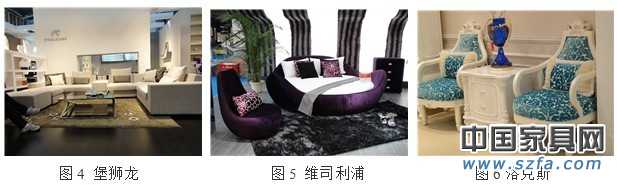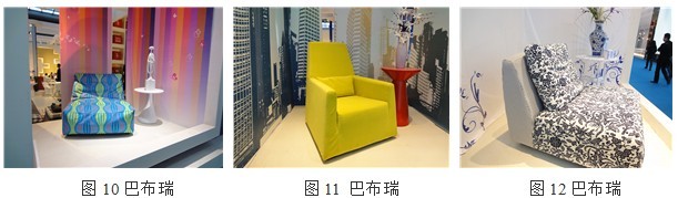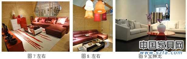風(fēng)格上以穩(wěn)重簡(jiǎn)約現(xiàn)代時(shí)尚為主導(dǎo),配飾環(huán)境(包括燈飾,床品,地毯等)大體分兩種風(fēng)格,一種是與軟體家具本身色調(diào)和諧的搭配,體現(xiàn)出家具與環(huán)境的和諧;如圖7與圖8左右的沙發(fā),紅色沙發(fā),配以含有紅色花紋的地?cái)偅t色靠枕,紅色系列餐具、柜子、燈飾,整體感強(qiáng)烈。另一種是與軟體家具本身色調(diào)形成鮮明對(duì)比的搭配方式,此類搭配,多數(shù)是黑白米色家具配以鮮明色彩的配飾,或者閃光的亮片類的布藝,以此在家具色彩單調(diào)的基礎(chǔ)上,構(gòu)建色彩空間,如堡獅龍白色沙發(fā)配上紅色茶幾,讓空間感覺不再單調(diào)。