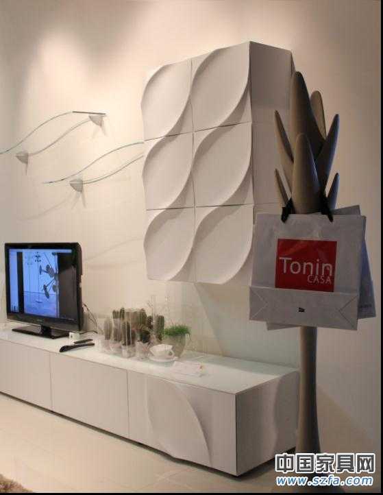 這是一款客廳組合柜,由Tonin Casa出品,對面板波紋流水狀的處理是該產品的一大特色,波紋面板單獨使用時,如地柜,新穎獨特,出類拔萃,當波紋面板配合在一起重復使用時,如吊柜,行云流水,潺潺涓涓。