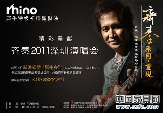 據(jù)了解,至6月7日,凡在全國各地指定賣場(chǎng)購買犀牛特級(jí)初榨橄欖油滿600元的消費(fèi)者即可獲贈(zèng)齊秦2011深圳演唱會(huì)門票一張。其中,購買犀牛特級(jí)初榨橄欖油滿3800元的消費(fèi)者,更可獲贈(zèng)價(jià)值2580元門票1張。與此同時(shí),凡是犀牛會(huì)會(huì)員積分滿6000積分,也可獲贈(zèng)價(jià)值380元門票1張。而在6月7日前加“犀牛會(huì)”新浪微博成為粉絲的消費(fèi)者,同樣有機(jī)會(huì)獲贈(zèng)演唱會(huì)門票和齊秦的簽名CD。