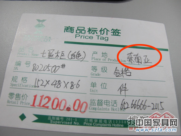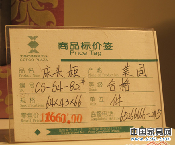 根據(jù)《上海家具行業(yè)產(chǎn)品三包責(zé)任規(guī)則》指出:標(biāo)價(jià)應(yīng)有中文標(biāo)明產(chǎn)品名稱、型號(hào)、產(chǎn)地、廠名、經(jīng)銷商或進(jìn)口代理商名、等級(jí)、計(jì)價(jià)單位、規(guī)格、基輔料等標(biāo)識(shí)。但記者發(fā)現(xiàn)中糧廣場入駐進(jìn)口品牌中天龍八部,大部分標(biāo)簽上只有品名、產(chǎn)地、編號(hào)、等級(jí)、規(guī)格、單位、零售價(jià)、監(jiān)督電話這八項(xiàng)。其中,少部分商家用黑色鉛字筆在標(biāo)簽右上方手寫標(biāo)明材質(zhì)。