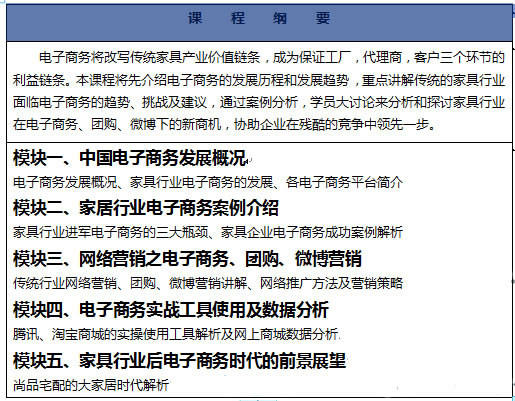 【培訓(xùn)對(duì)象】: 家具企業(yè)總裁、CE0、電子商務(wù)部負(fù)責(zé)人、品牌總監(jiān)