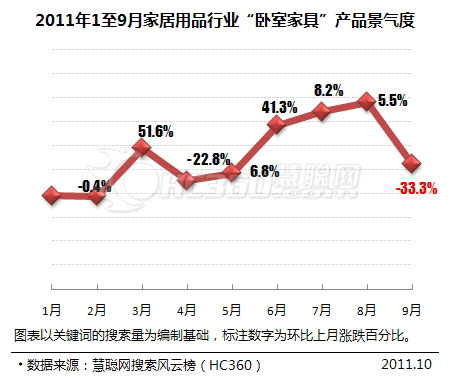 從圖表分析得出,一、二月份數(shù)據(jù)基本持平,進入三月份的大部分的人群開始一年忙碌的采購期,三月同比上兩個月增幅較大,環(huán)比增長51.6%,進入四、五月采購高峰期慢慢的消退了,隨之環(huán)比三月份有所下滑,不過從整體分析看,“臥室家具”6、7、8月份上升趨勢較明顯,這對于“臥室家具”來說無疑是件喜事。9月份相對于前三個月份環(huán)比下降了33.3%。