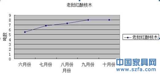 對比九月份、十月份的數(shù)據(jù)——紅酸枝木的價格一直在平穩(wěn)的一個區(qū)間內(nèi),未隨客戶需求量在不斷變化,小料供過于求,有小幅跌價之說,市場成交價格依然維持前期價位的現(xiàn)象。