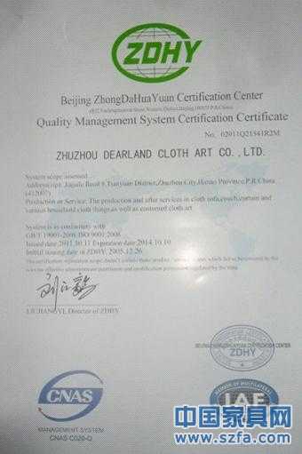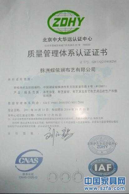 通過ISO9001質(zhì)量管理體系認(rèn)證是蝶依斕家居永恒的主題,質(zhì)量是一個(gè)品牌發(fā)展壯大的關(guān)鍵,在逐步完善質(zhì)量體系的進(jìn)程中,經(jīng)過長時(shí)間的準(zhǔn)備,2000年伊始,蝶依斕家居就申請(qǐng)了——ISO9000國際質(zhì)量體系認(rèn)證,此次認(rèn)證邀請(qǐng)的是國內(nèi)最權(quán)威的北就中大華遠(yuǎn)認(rèn)證中心作為蝶依斕質(zhì)量體系的審核單位,認(rèn)證的范圍包括蝶依斕家居布藝沙發(fā),布藝窗簾,布藝床及其它布藝有品的生產(chǎn)和售后服務(wù)。在本次考核過程中,認(rèn)證中心專家對(duì)蝶依斕家居產(chǎn)品的研發(fā)、生產(chǎn)、檢驗(yàn)等每個(gè)環(huán)節(jié)進(jìn)行了認(rèn)真、仔細(xì)的檢查,對(duì)產(chǎn)品標(biāo)準(zhǔn)、生產(chǎn)流程、工藝文件、原材物料管理制度等進(jìn)行了嚴(yán)格的檢查考核,此外,專家們還對(duì)蝶依斕公司質(zhì)量管理制度貫徹執(zhí)行情況進(jìn)行了檢查考核,所有檢驗(yàn)、考核都順利通過。