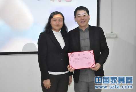 中國家具產(chǎn)業(yè)教育學(xué)院客座講師的授牌儀式上,中國家具產(chǎn)業(yè)教育學(xué)院策劃總監(jiān)董媛媛小姐與符凱老師合照
