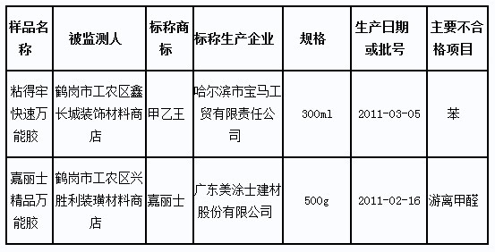 黑龍江省工商行政管理局近日通報流通領(lǐng)域膠粘劑質(zhì)量監(jiān)測結(jié)果,兩批次商品不合格。