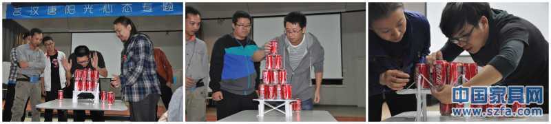 游戲規(guī)則:團(tuán)隊(duì)成員利用一定資源的A4紙和工具,扎造出一座美國(guó)舊金山的金門(mén)大橋,橋面寬度為易拉罐可樂(lè)高度,橋面高度為啤酒易拉罐高度,最后以承重易拉罐裝可樂(lè)的數(shù)量最多的團(tuán)隊(duì)為優(yōu)勝團(tuán)隊(duì)。
