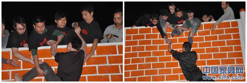 游戲規(guī)則:全隊(duì)所有成員在規(guī)定的時(shí)間內(nèi)翻越一面高4.2米的光滑墻面,在此過程中,所能用的資源只有每個(gè)人的身體,不能借助任何外界的工具。