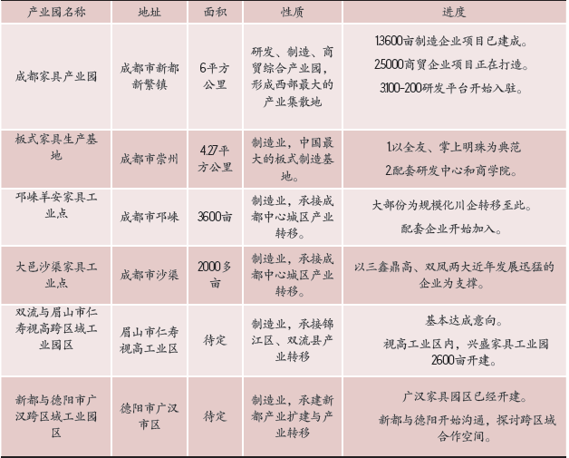 成都家具產(chǎn)業(yè)園是一個(gè)綜合性的家具產(chǎn)業(yè)園。 總規(guī)劃面積為9000畝,其構(gòu)成包括生產(chǎn),研發(fā),商貿(mào) (包括下步的區(qū)域總部):面積達(dá)3600畝制造業(yè)項(xiàng)目 已基本建成投產(chǎn),包括65個(gè)項(xiàng)目,其產(chǎn)業(yè)集聚和產(chǎn) 業(yè)鏈條優(yōu)勢(shì)初顯,發(fā)展顯示出良好態(tài)勢(shì),家具產(chǎn)業(yè)園 的影響已經(jīng)擴(kuò)大;面積為100-200畝土地則用于搭建 研發(fā)平臺(tái);而規(guī)劃中的商業(yè)配套用地則從原計(jì)劃的 1000畝增加至5000畝凈地。其中,產(chǎn)品展示占的比例 最大,約3500畝。