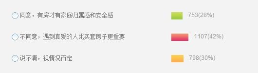 本次調(diào)查中同時有28%的網(wǎng)友認(rèn)同“同意,有房才有家庭歸屬感和安全感”這一觀點,認(rèn)為“結(jié)婚不買房,就是耍流氓”。