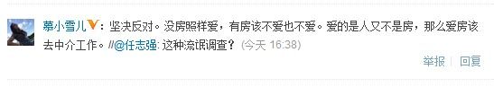 在大腕@任志強(qiáng)的轉(zhuǎn)發(fā)中,網(wǎng)友@慕小雪兒表示支持“不同意,遇到真愛的人比買套房子更重要”這一觀點。“堅決反對。沒房照樣愛,有房該不愛也不愛。愛的是人又不是房,那么愛房該去中介工作。”