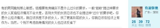 網(wǎng)友@有道張弛就支持這種觀點:有的男同胞別那么敏感,結(jié)婚要有房確實不是什么過分的要求。一般“膽敢”提這種要求的女人家庭經(jīng)濟(jì)情況不會太差,否則太窮的女孩應(yīng)該也不會提這種“過分” 的要求吧。你是什么經(jīng)濟(jì)情況,就應(yīng)該找差不多的女人,找了更高階層的女人,你就應(yīng)該在經(jīng)濟(jì)上有作為。當(dāng)然,個別不考慮自身情況的女人也應(yīng)該反省下。