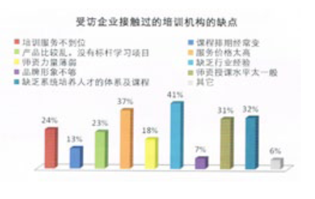 “缺乏行業(yè)經(jīng)驗(yàn)”和“服務(wù)價(jià)格太高”,成為企業(yè)接觸過的培訓(xùn)機(jī)構(gòu)的兩個(gè)主要缺點(diǎn),“講師的授課水平、課程排期經(jīng)常變動(dòng)、培訓(xùn)服務(wù)不到位”也是培訓(xùn)機(jī)構(gòu)不足的三個(gè)主要缺點(diǎn)。