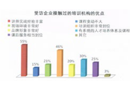 “講師實(shí)戰(zhàn)經(jīng)驗(yàn)豐富”以55%的比例成為企業(yè)接觸過的培訓(xùn)機(jī)構(gòu)的最大優(yōu)點(diǎn),“培訓(xùn)組織非常到位”以46%緊隨其后,說明培訓(xùn)機(jī)構(gòu)緊貼企業(yè)的需求,用實(shí)戰(zhàn)的講師和專業(yè)的運(yùn)作贏得了企業(yè)的贊譽(yù)。