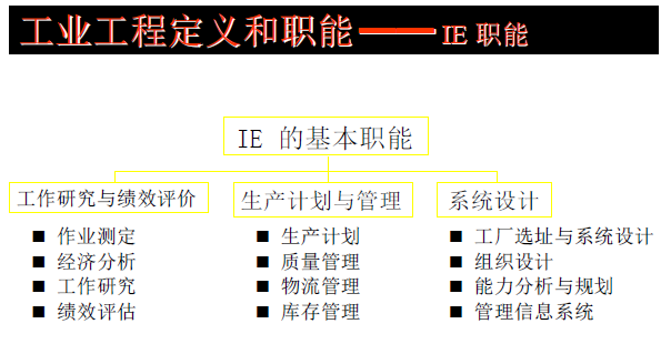 IE對企業(yè)經(jīng)營活動中的所有內(nèi)容都可以采用規(guī)劃、設計、評估和改善的思維和方法進行定量和定性地分析和優(yōu)化,從而達到更好的目的。