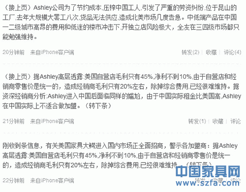 剛收到信息,有關(guān)美國家具大鱷進(jìn)入國內(nèi)市場正全面招商,警示各加盟商:據(jù)Ashley高層透露:美國自營店毛利只有45%,凈利不到10%,由于自營店和經(jīng)銷商零售價是統(tǒng)一的,造成經(jīng)銷商毛利只有20%左右,除掉綜合費(fèi)用,已經(jīng)很難維持。