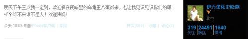 “明天下午三點我一定到,歡迎躲在陰暗里的烏龜王八蛋都來,也讓我見識見識你們的屌樣?誰不來誰不是人!歡迎圍觀!”