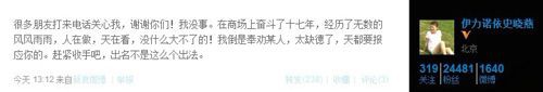 “很多朋友打來電話關(guān)心我,謝謝你們!我沒事。在商場上奮斗了十七年,經(jīng)歷了無數(shù)的風(fēng)風(fēng)雨雨,人在做,天在看,沒什么大不了的!我倒是奉勸某人,太缺德了,天都要報應(yīng)你的。趕緊收手吧,出名不是這么個出法。”