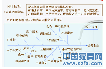 KPI指標(biāo):關(guān)鍵業(yè)績指標(biāo)。家具終端運(yùn)營的關(guān)鍵運(yùn)營指標(biāo)包括:市場占有率,單平方產(chǎn)出率,庫存周轉(zhuǎn)率,客戶滿意度,人均銷售比,產(chǎn)品性價(jià)比,促銷投入產(chǎn)出比等關(guān)鍵指標(biāo)。通過KPI把企業(yè)的戰(zhàn)略目標(biāo)分解為可運(yùn)作的遠(yuǎn)景目標(biāo)。