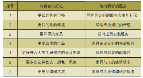 專家認為,家具企業(yè)的核心是營銷驅(qū)動;營銷驅(qū)勸的核心是終端為王;終端為王的核心是店面銷售;店面銷售的核心是為消費者創(chuàng)造價值。層層抽絲剝繭分析來看,消費者才是最終核心所在,攻克了這道難關,也就拿下了市場。然而從消費者立場來分析,市場的充分競爭恰好給消費者帶來了更多的好處和更好的服務,如下表: