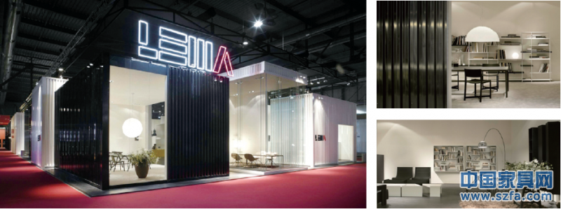 首先來看這個叫LEMA的品牌,它的關(guān)鍵詞是模塊化系統(tǒng)。從實景照上,LEMA設(shè)計總監(jiān)皮耶羅用黑白兩色的集裝箱,營造了九大空間,隔劃出LEMA產(chǎn)品的”白天系列”和”夜晚系列”。這種做法與東莞展上的CBD做法如出一轍,但是LEMA使用了單層集裝箱,用黑色來作為“夜晚系列”的空間,白色作為“白天系列”的空間。進入到這個展廳后,可以感受到白天家具和夜晚家具不同的氛圍。