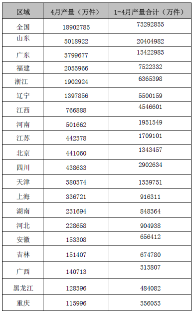 但是來自中商情報網(wǎng)的數(shù)據(jù),今年4月以及1-4月,山東位于各省木質(zhì)家具產(chǎn)量的首位,分別達到500多萬件、2040多萬件,占全國的26.55%、27.84%,并且與排名第二的廣東拉開了一定的距離。