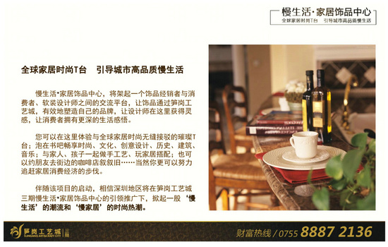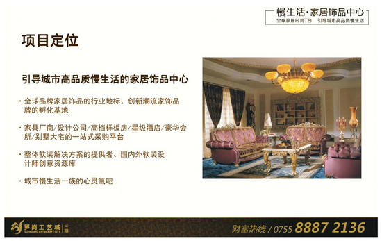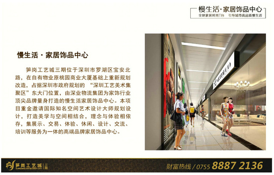 核心提示:筍崗工藝城地處羅湖區(qū)寶安北路與桃園路交匯處,位于政府恢弘規(guī)劃的筍崗家居飾品產(chǎn)業(yè)集聚地核心區(qū)域,自開業(yè)以來獲得了政府、市場(chǎng)和權(quán)威媒體的高度關(guān)注和支持,連續(xù)舉辦了數(shù)屆深圳文博會(huì)分會(huì)場(chǎng),并獲得了深圳市重點(diǎn)文化企業(yè)、深圳市文化產(chǎn)業(yè)基地、深圳市文化+旅游型示范園區(qū)等二十余項(xiàng)榮譽(yù)稱號(hào)。筍崗工藝城致力于成為國(guó)內(nèi)領(lǐng)先、國(guó)際化的家居飾品高端專業(yè)市場(chǎng)運(yùn)營(yíng)商,整體規(guī)劃30萬㎡,將打造成為超大規(guī)模的全球家飾采購(gòu)中心。