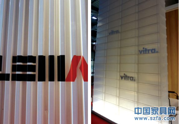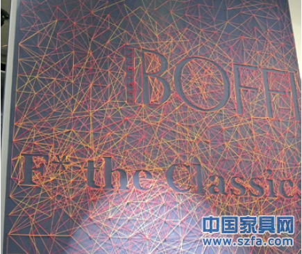 LOGO是人們對(duì)品牌記憶的符號(hào),其重要性不言而喻,為了很好的展示自己的LOGO,大家都會(huì)在上面花足心思。每年展會(huì)上,我們不難看見金光閃閃、造價(jià)不菲的各式LOGO,但設(shè)計(jì)的意義更在 于用創(chuàng)意來提升價(jià)值。米蘭展的這個(gè)品牌在簡單的背景板上,以紅黃兩色絨線通過編織的手法將品牌LOGO顯襯出來,花費(fèi)少,卻異常醒目。