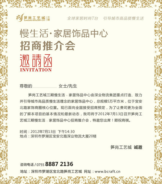 筍崗工藝城三期慢生活﹒家居飾品中心由深業(yè)物流集團重點打造、致力并引導城市高品質慢生活理念的家居飾品中心,總規(guī)模5萬平方米,位于寶安北路家飾商圈核心位置?,F(xiàn)已面向全國接受招商預定,為了讓貴單位更為全面的了解本項目的基本情況和最新動態(tài),我司擬于2012年7月13日召開筍崗工藝城三期慢生活﹒家居飾品中心招商推介會,特邀您在百忙之中出席!順祝商祺。