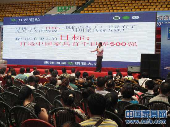 2012年7月4日,第二屆中國家具高峰論壇暨九天家私2012商務(wù)年會在成都市雙流體育館隆重舉行,本次會議記者以對話嘉賓身份出席——不靠近不知道,一靠近卻感受到了足夠的震撼:一是九天已經(jīng)是“中國馳名商標(biāo)”,這是川企少有的殊榮,屈指一數(shù)不到十個;二是九天將自己定位于“四川家具前五強(qiáng)”,而這需要多大的自信與魄力。據(jù)介紹“2009年,影視皇帝張國立先生攜手代言九天家私,出任名譽(yù)董事長世界500強(qiáng)企業(yè)高管丁驥先生(海歸雙碩士)入主九天,開啟新的征程。2010銷售從4000萬增至2億,進(jìn)入中國家具億元俱樂部,2011年引進(jìn)行業(yè)頂尖級策劃及爆破專家和團(tuán)隊,銷售劇增至4.5億,增速行業(yè)第一,2012 銷售目標(biāo)8億。”