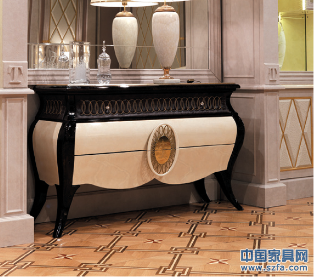 這一系列的產(chǎn)品風(fēng)格源于傳統(tǒng)的洛可可式樣,運(yùn)用C形、S形和渦旋狀曲線紋飾蜿蜒反復(fù),精心設(shè)計的貝殼狀拉手,鋸齒形莨苕葉雕刻紋飾,并以24K金箔裝飾,盡顯極致奢華、高貴典雅,白色高亮雙色漆的表面處理模糊了傳統(tǒng)與時尚之間的界限。