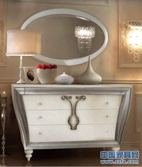 Emile系列源自流行于十九世紀(jì)末的新藝術(shù)主義。整個系列運(yùn)用一種反傳統(tǒng)的上大下小的倒錐形充滿失重感的夸張形體,采用鳶尾花藤蔓圖案,通過粗細(xì)漸變、彎曲、交叉纏繞等手法,組成一個充滿自然美的不對稱圖案,裝飾于家具表面上;并通過銀箔飾面與奶白雙色油漆以及施華洛士奇水晶,營造一種細(xì)膩、自然、充滿活力的時尚之美。