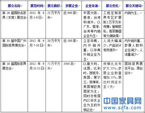 展會作為家具行業(yè)對外展示的一個窗口,始終吸引著眾多相關人士的目光。企業(yè)重視、參展者關注、媒體聚焦,9月展會月,再次成功吸引了所有的人關注和聚焦。在家具業(yè)市場不景氣的2012年,進一步拓展市場渠道成為家具企業(yè)的當務之急,那么,扎堆的展會到底能給家具企業(yè)帶來哪些受益?又能讓持續(xù)虧損的家具經(jīng)銷商看到什么希望之光?面對市場之變,家具展會又做出了哪些適時的調(diào)整?通過9月三大家具展會的對比,為您一一分析。