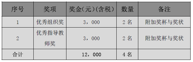 為鼓勵國內(nèi)更多的企業(yè)與院校參與此項活動,特為積極組織和參賽的企業(yè)與院校設立了“優(yōu)秀組織獎”,并專門針對院校組設立了“優(yōu)秀教師指導獎”,對那些指導學生參賽并獲得金、銀、銅獎的部分優(yōu)秀指導教師給予獎勵和鼓勵。這兩個獎項的具體數(shù)量和獎勵金額見下表: