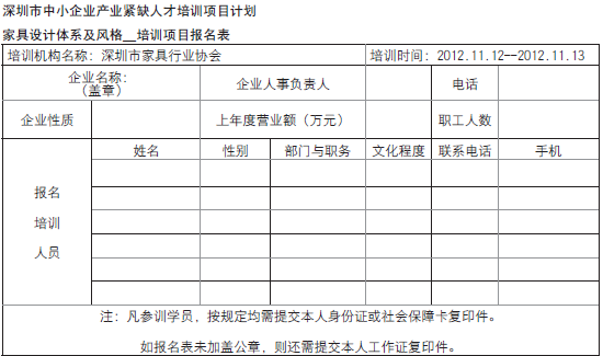 提高深圳市中小企業(yè)(家具企業(yè))家具生產(chǎn)技術(shù)與管理水平,根據(jù)市中小企業(yè)服務(wù)中心下達(dá)的《深圳市2012-2013年度中小企業(yè)產(chǎn)業(yè)緊缺人才培訓(xùn)項(xiàng)目計(jì)劃》,我司現(xiàn)面向全市中小企業(yè)舉辦“家具生產(chǎn)技術(shù)與管理培訓(xùn)班”。現(xiàn)將有關(guān)事項(xiàng)通知如下:
