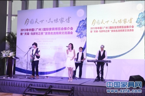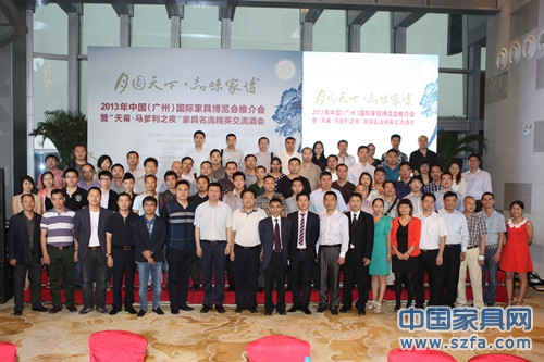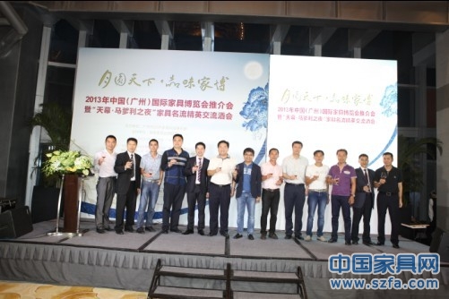 9月24日,2013年中國(廣州)國際家具博覽會推介會暨“天幕·馬爹利之夜”家具名流精英交流酒會在廣交會琶洲威斯汀酒店舉行。本次活動由廣州市020F家具俱樂部主辦,得到了中國(廣州)國際家具博覽會主辦方中國對外貿(mào)易廣州展覽總公司華佳分公司、順德家具品牌聯(lián)盟的大力支持,中國對外貿(mào)易廣州展覽總公司華佳分公司副總經(jīng)理陳旺輝,中國對外貿(mào)易廣州展覽總公司華佳分公司副總經(jīng)理吳佶強(qiáng)、中國家具品牌聯(lián)盟監(jiān)事會主席、康升集團(tuán)總裁劉永康,順德家具品牌聯(lián)盟主席、華倫蒂詩家具有限公司總經(jīng)理周振揚(yáng)、廣州市020F家具俱樂部執(zhí)行董事莊子標(biāo),以及家具企業(yè)老總、行業(yè)精英、新聞媒體等100多人參加了活動。