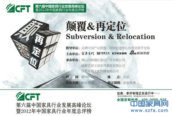 為此,由《家具導(dǎo)刊》發(fā)起,攜手《家具主流》、《華東家具》、新浪家居聯(lián)合主辦,并得到了中國家具行業(yè)眾多協(xié)會,以及多個權(quán)威品牌專業(yè)研究機構(gòu)的大力支持,本年度中國家具行業(yè)的奧斯卡盛會——“顛覆&再定位:中國家具行業(yè)發(fā)展高峰論壇暨第六屆(2012)中國家具行業(yè)年度總評榜”于10月15日正式啟動。本屆總評榜將以“顛覆”思維為驅(qū)動,以“再定位”為研究主題,把脈中國家具產(chǎn)業(yè)鏈的病態(tài),感受轉(zhuǎn)型下內(nèi)需市場的呼吸,對話企業(yè)再定位與產(chǎn)業(yè)生態(tài)鏈的重構(gòu),研究轉(zhuǎn)型升級的戰(zhàn)術(shù),探索脫穎而出的陽光大道。