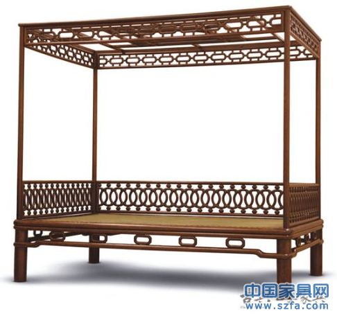 拍品詳情:床尺寸寬大,方形四柱,上圍子、牙板鏤雕絳環(huán)紋,床圍子鏤雕連圈紋,通靈透亮。足部圓柱形,光素。此床雕刻精簡,格調(diào)高雅。黃花梨四柱架子床并不常見,明閔齊伋繪刻西廂記彩圖(1640年)第十三頁載錄一張四柱架子床,見2001年加州出版《AustereLuminosityofChineseClassicalFurniture》,145頁,圖10.6。其它存世品極少。另一張形制相若的四柱架子床為RobertandWilliamDrummond收藏,見1978年香港出版G.Ecke著《ChineseDomesticFurniture》,圖版25號。此床曾1999年9月16日于紐約佳士得拍賣,拍品79號。