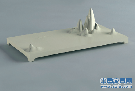 試圖將國畫山水的平面形態(tài)轉(zhuǎn)化為三維意境。過程是純理性的三維軟件運算建模,由模具廠數(shù)控精加工成為原模,再翻制成石膏模具,制成陶瓷山水。結(jié)果,一個近乎三維游戲的場景竟然也可以如此感性!因為,大家都遺傳了山水的情懷。