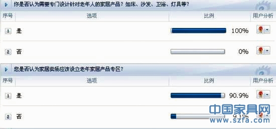 重陽節(jié)前夕,新浪家居聯(lián)合參考消息北京參考做了一份有關(guān)老年家居市場(chǎng)調(diào)查的網(wǎng)絡(luò)調(diào)查。其中一項(xiàng)關(guān)于“你是否認(rèn)為需要專門設(shè)計(jì)針對(duì)老年人的家居產(chǎn)品?如床、沙發(fā)、衛(wèi)浴、燈具等”的調(diào)查中,100﹪的網(wǎng)友表示需要。在另一項(xiàng)關(guān)于家居賣場(chǎng)是否該設(shè)立老年家居產(chǎn)品專區(qū)的調(diào)查中,90.9﹪的網(wǎng)友選擇了是。可見,老年家居包括老年家具在內(nèi)的消費(fèi)訴求很高。 新浪家居聯(lián)合參考消息北京參考有關(guān)老年家居市場(chǎng)調(diào)查部分調(diào)查結(jié)果