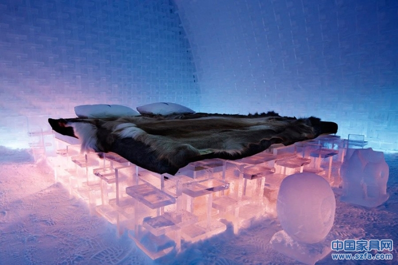 冰酒店的客房各具特色,絕不雷同。照片呈現(xiàn)的客房名為“次元之旅”,雙人床的設(shè)計極富創(chuàng)意。冰酒店為客人們準(zhǔn)備了冬衣、手套和鞋子,讓他們度過溫暖的夜晚。早上起來,客人們可以享用自助早餐和桑拿浴。