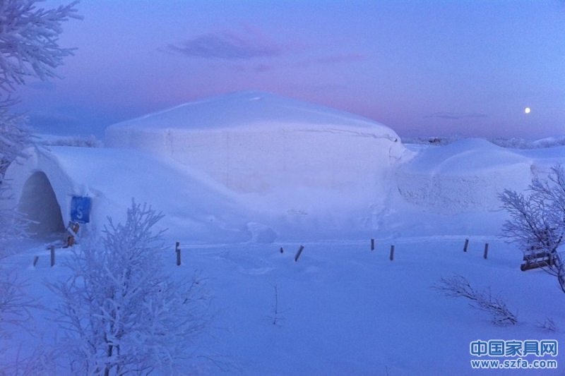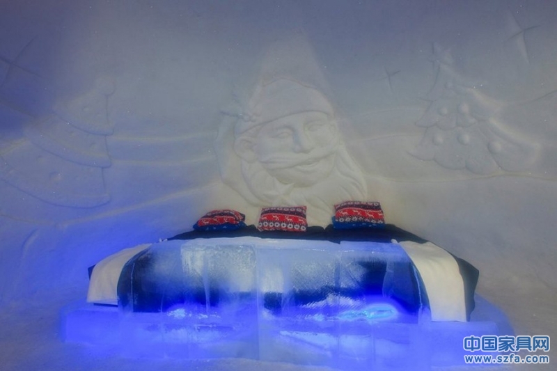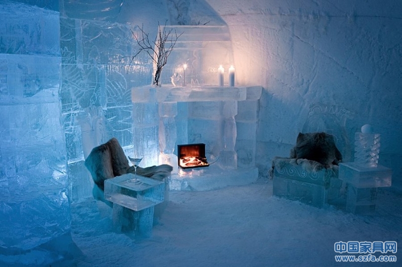 索利斯尼瓦冰屋酒店建有30間客房,其中包括2間套房,房間里的家具全冰打造,同時裝點(diǎn)著精美的冰雕。