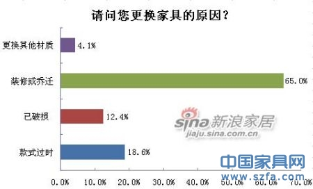 調(diào)研數(shù)據(jù)顯示,裝修或喬遷原因?qū)е录揖呦M超過65%,破損和款式過時分別占到12.37%和18.56%,對于材質(zhì)更換的需求僅為4.1%。調(diào)研對于分析家具消費意向有指導(dǎo)意義。