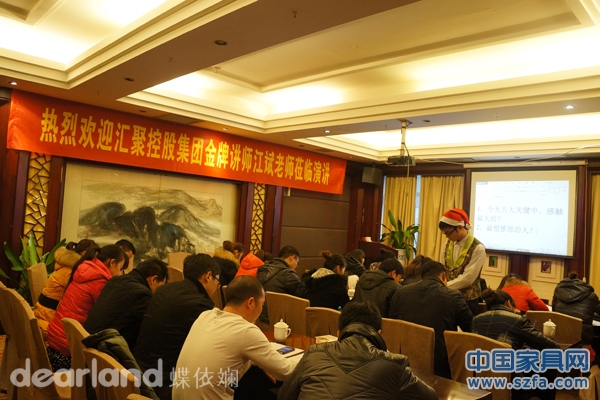 2012年12月24日,蝶依斕家居布藝湖南公司誠邀匯聚國際教育集團金牌講師江斌老師,進行了一次《真正的執(zhí)行》培訓(xùn)課程。蝶依斕家居布藝公司花重金舉辦這次培訓(xùn)課程,旨在培養(yǎng)和建設(shè)一支素質(zhì)高、執(zhí)行力強的優(yōu)秀企業(yè)團隊,提高員工工作效能和職業(yè)素養(yǎng)。蝶依斕湖南公司本部20多名中高層管理人員參加此次課程,公司董事總經(jīng)理陳紅英、董事副總經(jīng)理卿科華、董事副總經(jīng)理陳章毅也紛紛到場接受了培訓(xùn)。