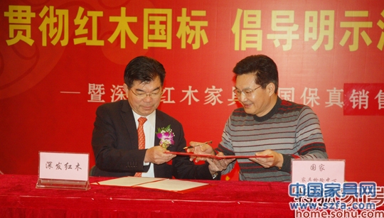 會議首先進行簽約環(huán)節(jié)。深發(fā)紅木董事長張祝林、中國林科院木材工業(yè)研究所所長助理、中國林產(chǎn)工業(yè)協(xié)會紅木分會常務(wù)理事長呂斌研究員、中國家具協(xié)會傳統(tǒng)家具委員會秘書長姜恒夫等分別就深發(fā)紅木簽約保真銷售進行了熱情洋溢的致詞,之后再各方人士的見證下,深發(fā)紅木董事長張祝林與國家家具及室內(nèi)環(huán)境質(zhì)量監(jiān)督檢驗中心主任羅炘共同簽署了“深發(fā)紅木家具全國保真銷售協(xié)議”。