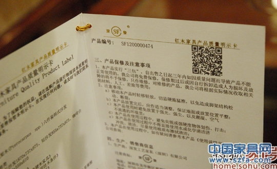 在消費者如何區(qū)分紅木家具的“全”與“不全”等問題上行業(yè)專家也給出了詳盡的答案。而對于在購買合同上能否直接標(biāo)稱“全紅木家具”的問題,中國林產(chǎn)工業(yè)協(xié)會紅木分會秘書長殷亞方研究院也給出了“這樣標(biāo)注并不合理”的解釋。 產(chǎn)品質(zhì)量明示卡 產(chǎn)品質(zhì)量明示卡